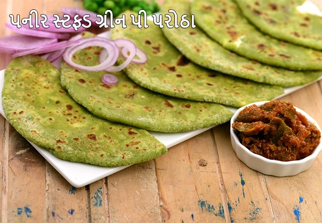 પનીર સ્ટફ્ડ ગ્રીન પી પરોઠા | Paneer Stuffed Green Pea Paratha, Matar Paneer Paratha | ઘઉંના લોટની સાથે લીલા વટાણાના સંયોજન વડે તૈયાર થતી એક ખાસ પ્રકારની કણિક આ વાનગીની મુખ્ય અને મહત્વની જરૂરીયાત છે. તેમાં તાજું પનીર અને રસદાર કિસમિસ ઉમેરવાથી પરોઠા એક પથ્ય વાનગી બની રહે છે.