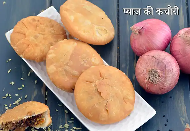 પ્યાજ કચોરી — મસાલેદાર ડુંગળીથી ભરેલી, પરતદાર ડીપ–ફ્રાઈડ કચોરી; સમગ્ર રાજસ્થાનમાં લોકપ્રિય નાસ્તો/સ્ટ્રીટ ફૂડ।