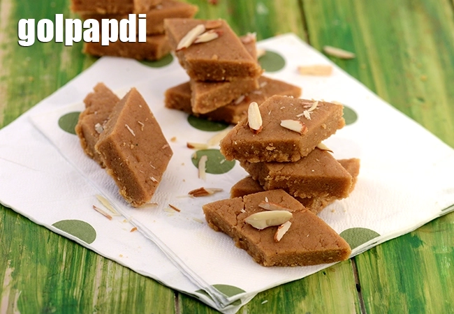 Gol Papdi is a traditional jaggery-sweetened wheat flour fudge.
