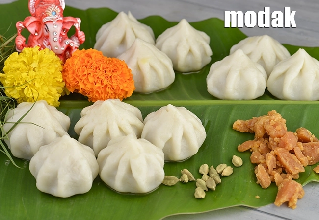 The modak has a soft, melt-in-the-mouth texture with a delicate sweetness.
