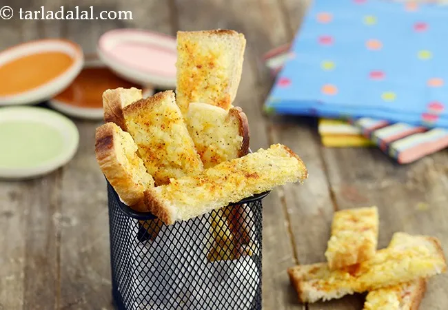 2. Cheesy Bread Fingers Cheesy Bread Fingers are a perfect accompaniment for soups. Bread, coated with a luscious topping of mustard flavoured cheese and butter, is toasted in an oven till the cheese melts and coats the crisp and crunchy toast.