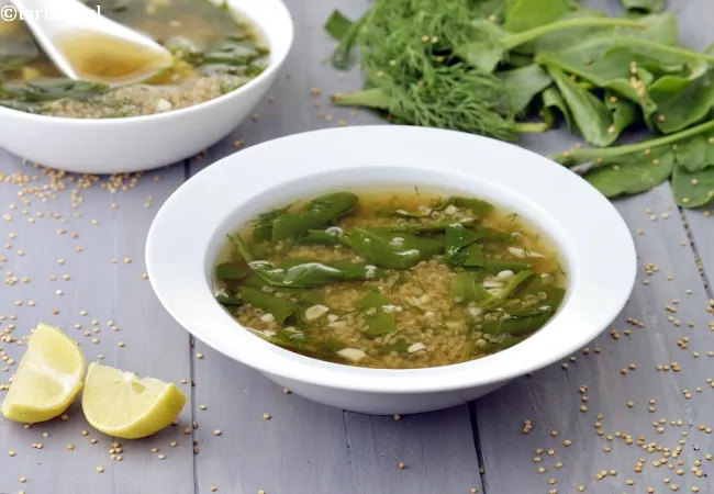 lemony quinoa and baby spinach soup recipe | quinoa and dill soup | healthy Indian quinoa baby spinach soup |
