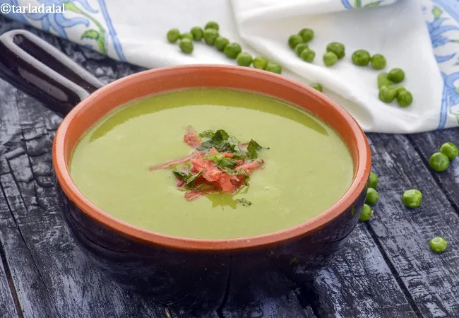 Here is a fabulous healthy Indian pea soup with an attractive pale-green colour and rich texture, made with green peas and onions.