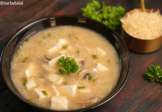 Mushrooms are another health-friendly ingredient which cannot be missed out when we talk of healthy soups. Simmered in a delectable stock, the aroma of mushrooms cooked with chopped ginger and spring onion greens will surely bring all the family members on the dining table. For slight crunch and enjoyment we have added whole wheat vermicelli. If you wish you can avoid it or reduce the quantity in Paneer Vermicell and Mushroom Vegetable Broth.