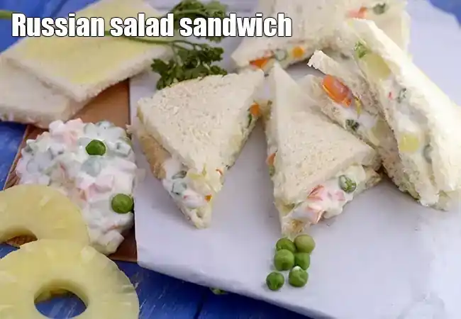 Creamy and rich sandwich made using Russian salad filling.