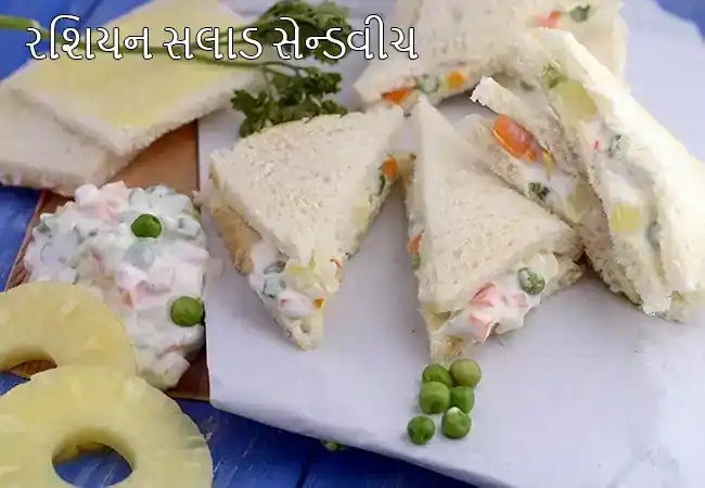 રશિયન સલાડ ફિલિંગ સાથેનો ક્રીમી અને રિચ સેન્ડવિચ.