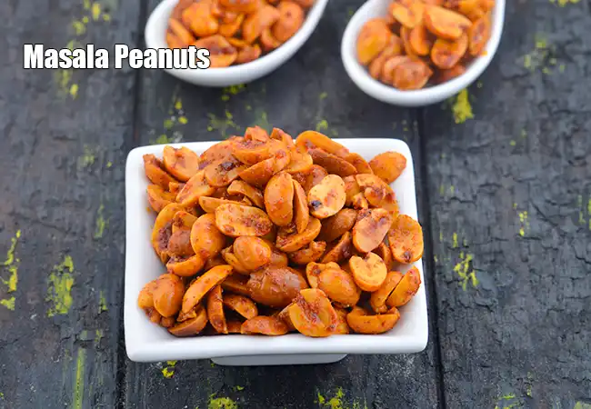 મસાલા પીનટ્સ: બેસન અને મસાલાની પરત ચઢેલી ડીપ-ફ્રાઇડ મગફળી. આ ખૂબ કરકરી, તીખી અને સ્વાદિષ્ટ હોય છે. કોઈ ઝંઝટ વગર પરોસાય તેવા આ નાસ્તા કોકટેલ પાર્ટી માટે પરફેક્ટ છે.