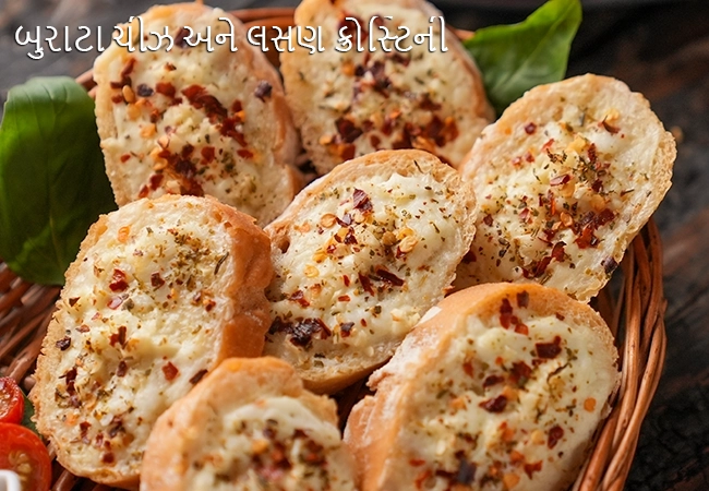 બુર્રાટા ચીઝ અને ગાર્લિક ક્રોસ્ટીની કરકરા ટોસ્ટ કરેલા બ્રેડ પર ક્રીમી બુર્રાટા ચીઝ અને હળવો લસણનો સ્વાદ ધરાવે છે, જે પાર્ટી માટે એક રિચ, સ્મૂથ અને એલેગન્ટ બાઇટ આપે છે.