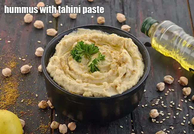 હમસ વિથ તાહીની: ચણા, તાહીની, લસણ અને લીંબુથી બનેલો ક્રીમી ડિપ, જે પીટા બ્રેડ અથવા શાકભાજી સાથે સરસ લાગે છે.