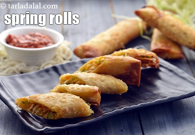 વેજ સ્પ્રિંગ રોલ્સ: શાકભાજી અને નૂડલ્સથી ભરેલા કરકરા રોલ્સ, જેમાં આદુ-લસણ અને સોયા સોસનો સ્વાદ હોય છે. સ્વીટ ચિલી અથવા શેઝવાન સોસ સાથે ખૂબ લોકપ્રિય છે.
