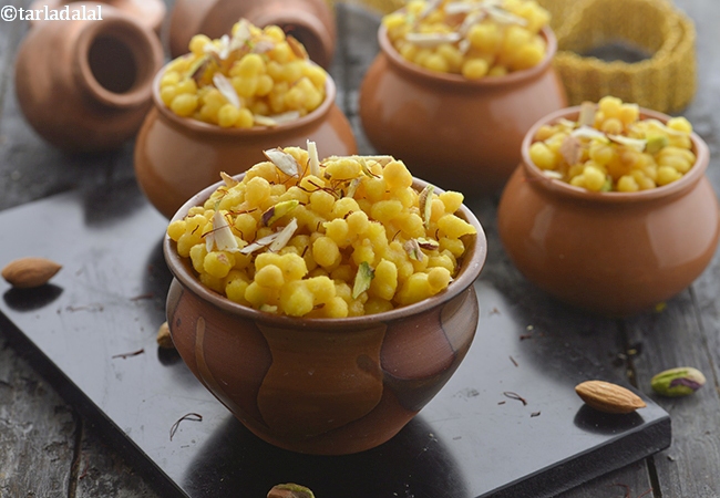 2. स्वीट बूंदी : मीठी बूंदी, बेसन की छोटी मीठी कुरकुरी तली हुई गेंदें होती हैं जिन्हें चीनी की चाशनी में मीठा किया जाता है। भारतीय त्योहारों के दौरान, कई मिठाइयाँ बनाई जाती हैं और स्वीट बूंदी उन सभी में से एक है जो मुझे पसंद है।