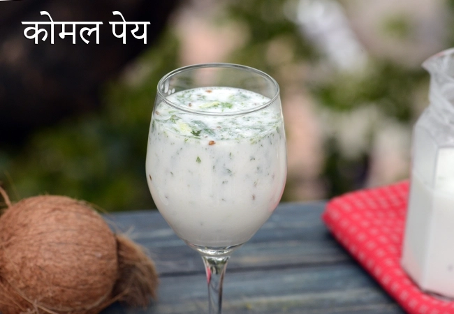 सुंदर, अपने नाम की तरह! मसालेदार दही और नारियल के दूध का एक दुर्लभ संयोजन कोमल | गुजराती कोमल पेय | गुजरात का कोमल ड्रिंक गर्मियों के लिए | नारियल के स्वाद वाली छाछ | komal drink को एक मसालेदार लेकिन ठंडा गुजराती पेय बनाता है। हालांकि हरी मिर्च इस पेय के प्रमुख स्वाद का प्रतिनिधित्व करती है, परोसने से पहले उन्हें त्यागने से यह सुनिश्चित हो जाता है कि मिर्च के टुकड़े पीने वाले को बाधित नहीं करते हैं।