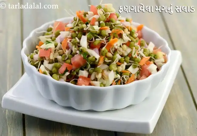 સ્પ્રાઉટેડ મૂંગ સલાડ (~100 કેલરી) તાજગીભર્યું, પ્રોટીનથી ભરપૂર અને ખૂબ હળવું – બપોરના સ્નેક અથવા સાઇડ માટે પરફેક્ટ. ક્રન્ચી શાકભાજી + લીંબુનો તડકો, સ્વાદિષ્ટ! રેસિપી જુઓ