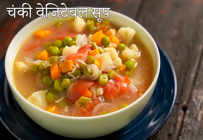 चंकी वेजिटेबल सूप रेसिपी | हार्टी वेजिटेबल इन्डीअन स्टू | सब्जी सम्मिश्रण | वेजिटेबल स्टॉक के साथ देशी सब्जी का सूप | चंकी वेजिटेबल सूप की एक सर्विंग में 91 कैलोरी, कम कार्ब, 18% फोलिक एसिड, 17% विटामिन ए, 89% विटामिन सी, 16% कैल्शियम, 24% आयरन, 20% फाइबर, आपके अनुशंसित आहार भत्ते (आरडीए) का 42% फॉस्फोरस होता है।