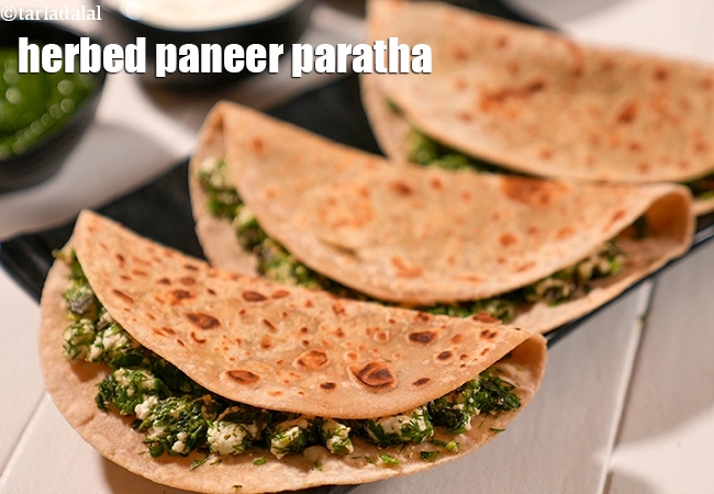હર્બ્ડ પનીર પરાઠા – લો-ફેટ પનીર અને તાજી જડીબુટ્ટીઓથી ભરપૂર, પ્રોટીન અને કેલ્શિયમનો સારો સ્ત્રોત।