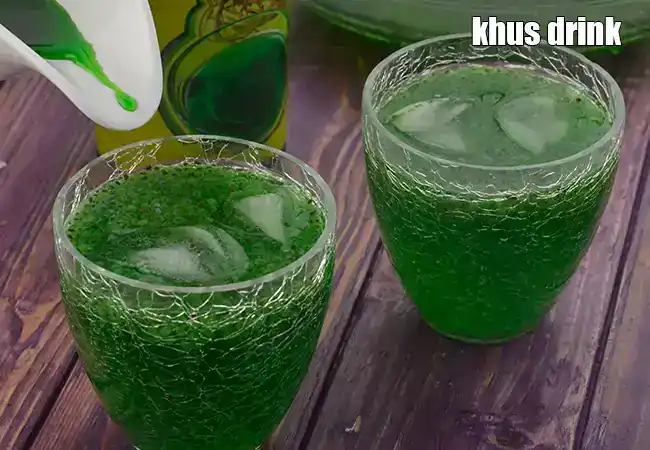 ખસ ડ્રિંક એક ઠંડક આપતું પેય છે, જે ખસ શરબત, પાણી અને ક્યારેક દૂધથી બનાવવામાં આવે છે. તેની સુગંધ માટી જેવી ખાસ હોય છે અને તેનો સ્વાદ બહુ જ રિફ્રેશિંગ લાગે છે. આ ડ્રિંક ઉનાળાની બપોરમાં ખૂબ પસંદ કરવામાં આવે છે. ખસ તેના કૂલિંગ ગુણધર્મો માટે જાણીતું છે અને શરીરને શાંત અને હાઇડ્રેટેડ રાખવામાં મદદ કરે છે. તેનું સુંદર લીલું રંગ તેને વધુ આકર્ષક અને પાર્ટી માટે પરફેક્ટ બનાવે છે. બરફ સાથે ઠંડું સર્વ કરવાથી તેનો સ્વાદ વધુ જ સરસ લાગે છે।