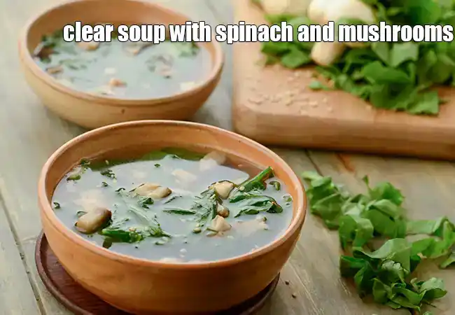 A healthy Indian vegetable clear soup made with shredded spinach, sliced mushrooms,