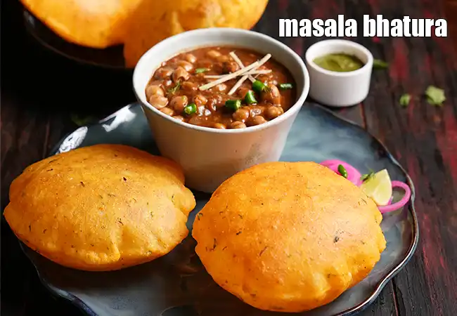 મસાલા ભટૂરા — મસાલેદાર છોલા, ડીપ ફ્રાય કરેલા ફૂલેલા ભટૂરા સાથે; ઉત્તર ભારતની ક્લાસિક વાનગી।