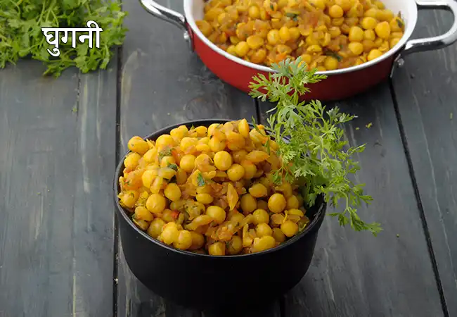 घुघनी — काले चने की गाढ़ी और मसालेदार करी।