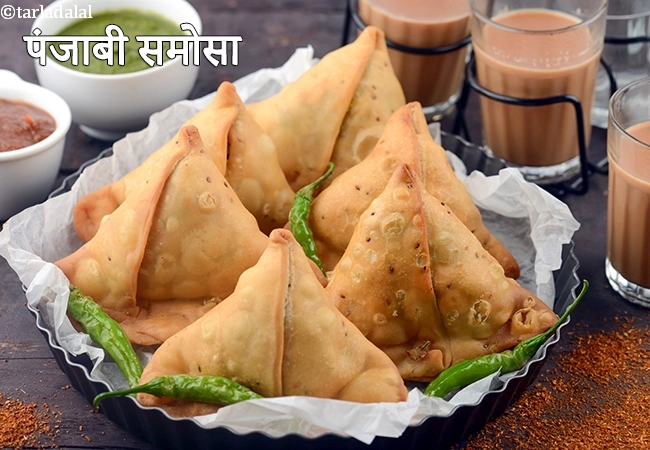 समोसा — मसालेदार आलू और मटर से भरी त्रिकोणीय पेस्ट्री।