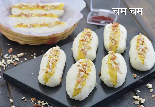 चमचम — सूखे मेवों से सजी नरम दूध की मिठाई।