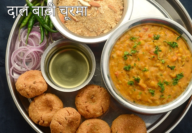 दाल बाटी चूरमा (शाकाहारी) — राजस्थानी दाल, बेक की हुई बाटी और मीठा चूरमा।