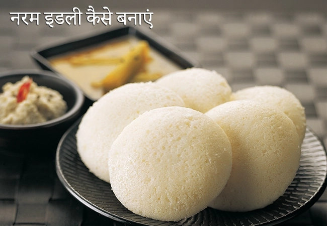इडली — चावल और दाल से बनी नरम, भाप में पकी इडली।