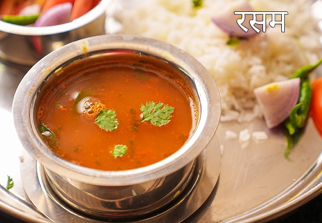 रसम — काली मिर्च और इमली का हल्का खट्टा सूप, चावल के साथ परोसा जाता है।