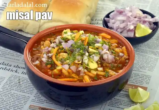 A spicy curry of sprouted beans topped with farsan, onions, and lemon, served with pav. The rassa (gravy) adds heat, making it a hearty meal. Variations include Kolhapuri-style for extra spice. It's nutritious due to pulses and enjoyed as breakfast or lunch.