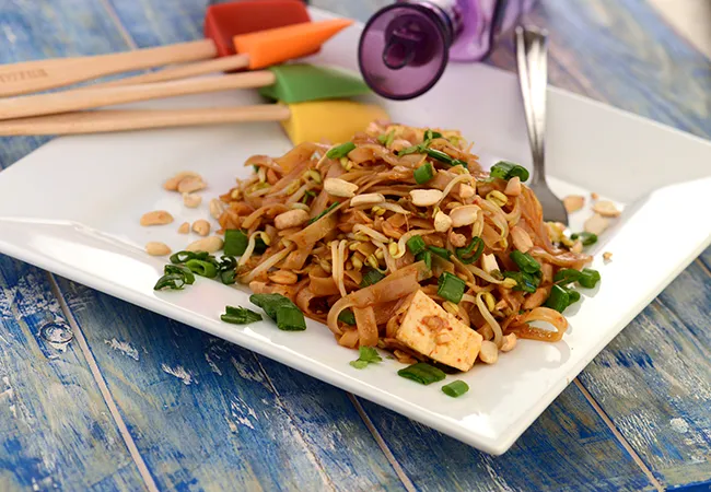 5. Vegetarian Pad Thai Noodles flat rice noodles are cooked and tossed with paneer, spring onion, bean sprouts, peanuts, garlic and other spices.