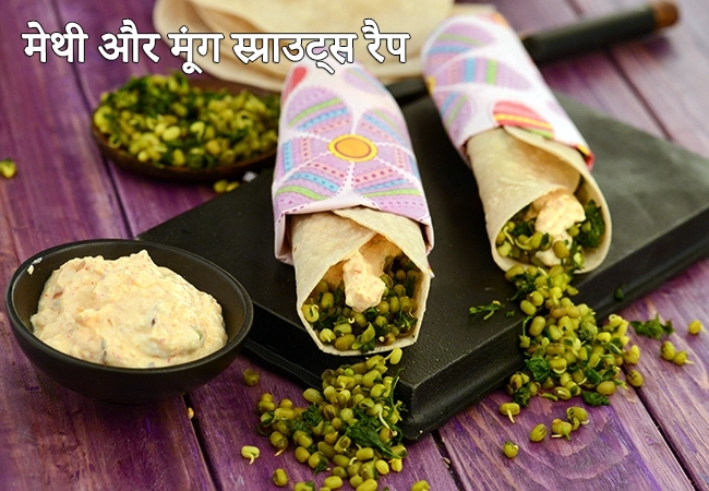 मेथी और मूंग स्प्राउट्स रैप एक हेल्दी रैप है, जो अंकुरित मूंग और ताज़ी मेथी की पत्तियों से बनाया जाता है। यह प्रोटीन, फाइबर और पोषक तत्वों से भरपूर होता है, इसलिए फिटनेस-फ्रेंडली मील्स के लिए एकदम आदर्श है। स्प्राउट्स इसमें क्रंची टेक्सचर देते हैं, जबकि मेथी का हल्का कड़वा स्वाद फ्लेवर को बैलेंस करता है। यह रैप हल्का होने के बावजूद पेट भरने वाला होता है और नाश्ते या लंच के लिए अच्छा विकल्प है। यह उन लोगों के लिए परफेक्ट है जो बिना भारी खाना खाए हेल्दी डाइट फॉलो करना चाहते हैं। बेहतर स्वाद के लिए इसे दही या चटनी के साथ सर्व करें। यह बैलेंस्ड डाइट के लिए एक बेहतरीन वन डिश मील है।