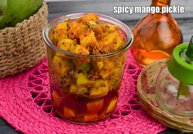 કાચી કેરીના ટુકડાઓને લાલ મરચાં, સરસવ, મેથી અને સરસવના તેલ સાથે મિક્સ કરવામાં આવે છે.
