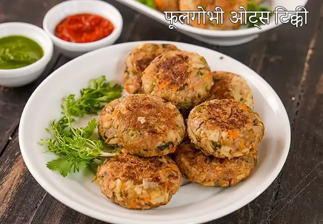 कॉलीफ्लावर ओट्स टिक्की बेक्ड/तवे पर हेल्दी टिक्की कॉलीफ्लावर और ओट्स से — लो-कैल, वेजी पैक्ड और क्रंची (~१५ मिनट)। हिंदी लिंक: https://www.tarladalal.com/cauliflower-oats-tikki-healthy-mixed-vegetable-tikki-hindi-39905r