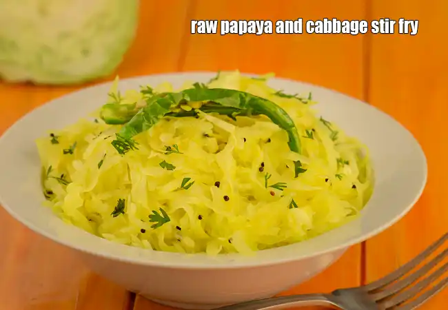 raw papaya and cabbage stir fry recipe | healthy raw papaya stir fry | low calorie vegetable stir fry | Indian style stir fried raw papaya and cabbage |