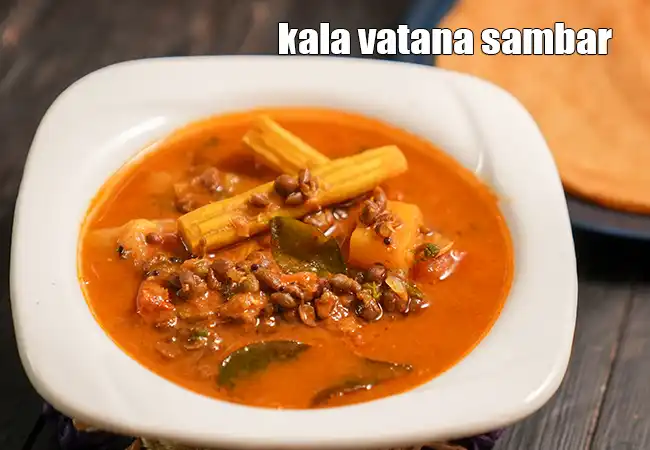 kala vatana sambar recipe | diabetes and kidney friendly kala vatana sambhar | South Indian style black peas sambhar | kala vatana sambar is a protein-packed, hearty and flavorful South Indian dish that combines the goodness of pulse and a variety of vegetables, simmered in a flavorful tamarind and spice-infused broth. The key ingredient is black peas (kala vatana), which are soaked overnight, then pressure cooked until tender and mashed to form a base to the sambhar.