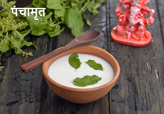 पंचामृत पाँच सात्त्विक सामग्री—दूध, दही, शहद, घी और शक्कर—से बनाया जाता है। यह पूजा में अर्पित किया जाता है और व्रत के बाद ग्रहण किया जाता है। इसे अत्यंत शुभ और पौष्टिक माना जाता है।