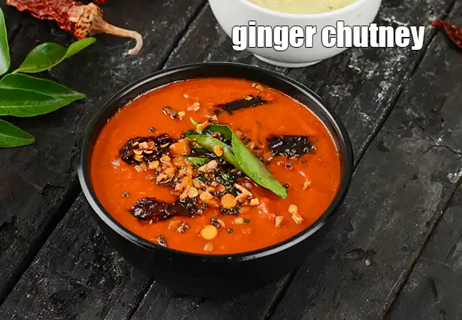 Ginger Chutney. The pungent notes of ginger combined with garlic, red chillies, tamarind, jaggery and spices, topped with a traditional tempering in coconut oil, make this tangy, sweet and sour chutney a lip-smacking treat.