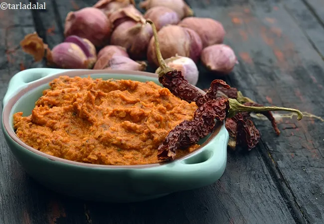 Red Garlic Chutney might end up stealing the thunder out of the main course! serve with relatively bland main course dishes such as idlis, dosas and lemon rice.