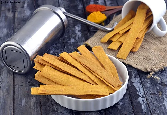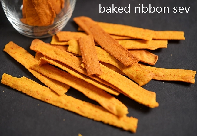 Baked Ribbon Sev | healthy gram flour sticks | baked ribbon murukku is so healthy and equally tasty! Made of besan and whole wheat flour, its baked instead of fired to make a perfect jar snack.