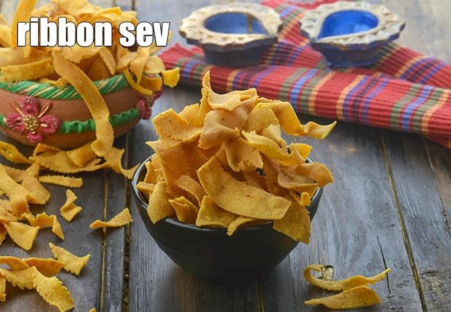 Ribbon Sev | ribbon pakoda | ribbon murukku | ola pakoda | ottu pakoda in south india also known as Ribbon Pakoda, Ola Pakoda or Ottu Pakoda in South India is a broad, ribbon-shaped sev that is super crisp because of the perfect proportioning of rice flour, besan and butter.