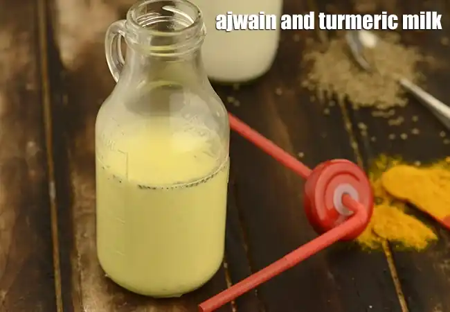 Ajwain And Turmeric Milk Recipe (Haldi Ajwain Ka Doodh) Ajwain and turmeric milk is a soothing drink to relieve sore throat, made by dry roasting carom seeds, boiling milk with turmeric powder, and combining them. It has a slightly-spicy taste that soothes throat irritation caused by cold and cough. Turmeric’s curcumin wards off bacteria, while ajwain’s thymol inhibits bacterial growth and aids digestion. Drink two glasses hot per day for two or three days to alleviate symptoms.