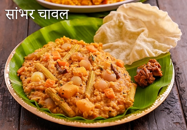 सांभर राइस एक आरामदायक एक-पात्र भोजन है, जिसमें चावल, दाल, सब्ज़ियाँ और सुगंधित मसाले शामिल होते हैं। यह कार्बोहाइड्रेट, प्रोटीन और फाइबर का संतुलित मिश्रण प्रदान करता है। इसका स्वाद हल्का तीखा और खट्टा होता है, जिससे यह संतोषजनक और पचने में आसान बनता है। इसे अक्सर दोपहर के भोजन में खाया जाता है। घी या पापड़ इसका स्वाद बढ़ाते हैं।