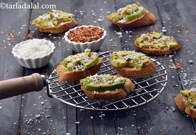 Avocado and Coconut Crostini delectable version, crostinis topped with an innovative combination of avocado, coconut oil and freshly-grated coconut.