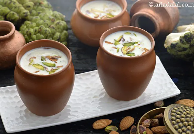 Indian desserts using custard apple, sitafal. The combination of milky and fruity flavours is extremely soothing in this Sitafal Phirni. Milk thickened with rice flour is flavoured with custard apple pulp and refrigerated to enhance the flavour and get the perfect consistency.