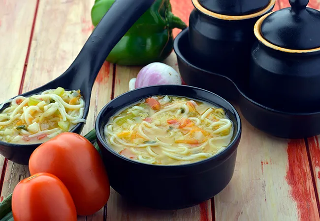 1. Vegetable and Noodle Soup made using Hakka noodles and some colorful vegetables can be perked up with peppy accompaniments like soy sauce, chilies in vinegar and chili sauce.