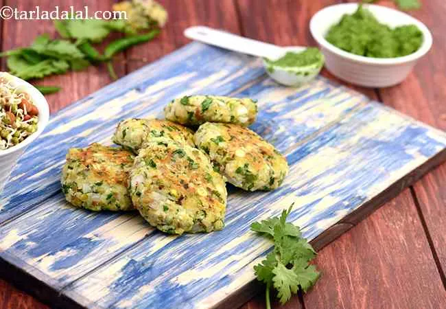 Mixed sprouts and chana dal tikki uses both masoor dal, chana dal with some added paneer. Also use of pulses makes this recipe high in fibre and iron.