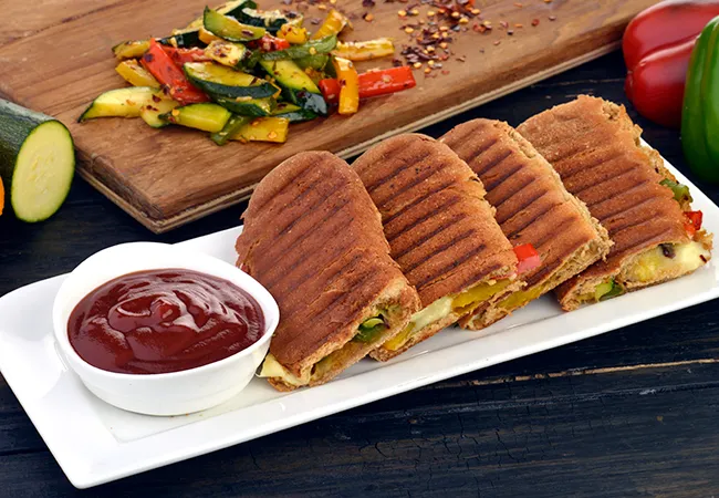 4. Zucchini and Bell Pepper Sandwich mellow zucchini, pungent capsicum, peppy herbs and spiky spices come together to make a mind-boggling filling for mustard-lined hot dog rolls.