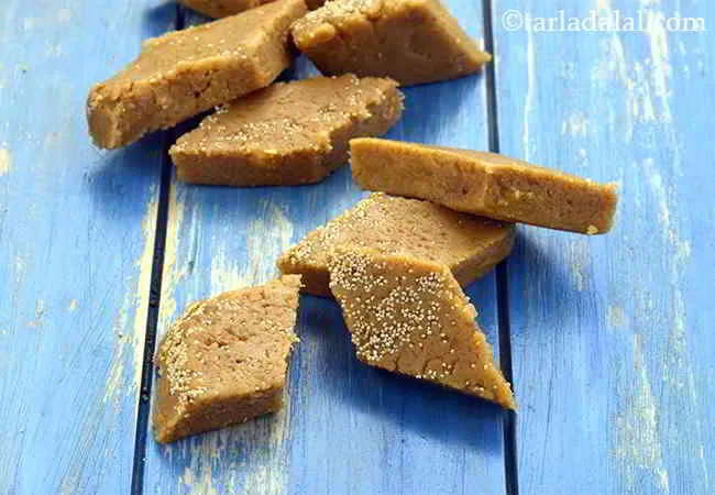 Even though Golpapdi is usually made with only whole wheat flour, making it with jowar flour and rice flour gives a nice twist to the original, and just like that you have desserts made with Rice flour.