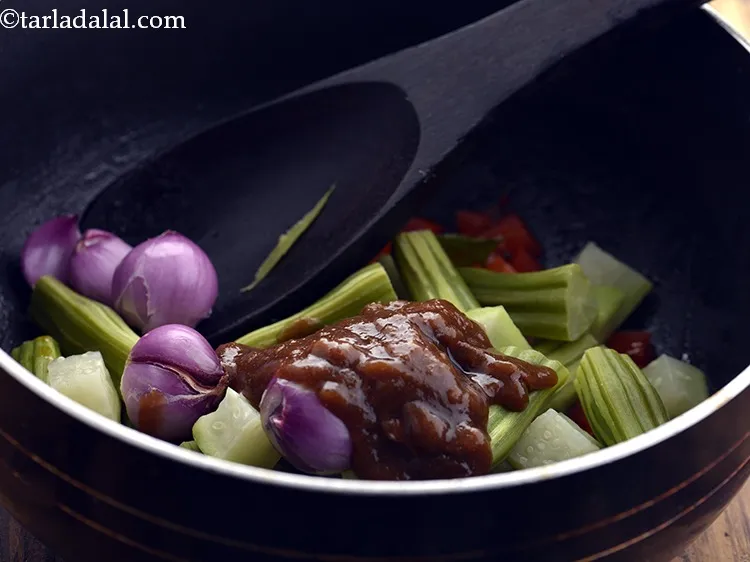 मध्यम आंच पर ४ से ५ मिनट के लिए या सब्जियों के नरम होने तक पकाएं। सब्जीयां अपने आकार में ही रहनी चाहिए, ना कि मसी।