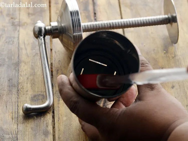 - Grease the ribbon shaped ( the one with vertical lines) press mould with little oil, put a portion of the dough into it, press it and cover it with the lid.